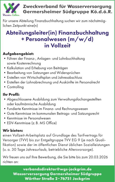 Wir freuen uns auf Ihre Bewerbung, die Sie bitte bis zum 20.03.2026 richten an: verbandsdirektor@wgs-jockgrim.de