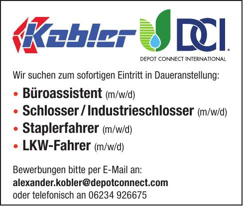 Bewerbungen bitte per E-Mail an: alexander.kobler@depotconnect.com oder telefonisch an 06234 926675