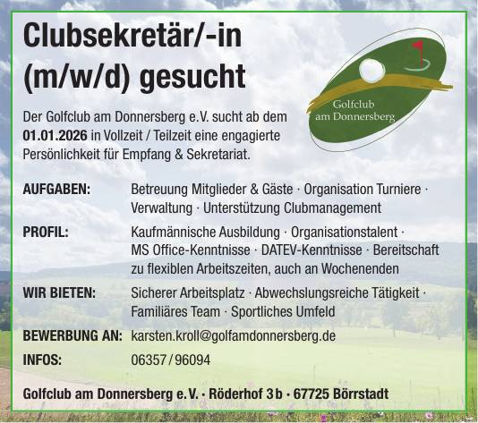 Der Golfclub am Donnersberg e.V. sucht ab dem01.01.2026 in Vollzeit / Teilzeit eine engagierte Persönlichkeit für Empfang & Sekretariat.