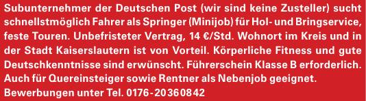 für Hol- und Bringservice, feste Touren. Unbefristeter Vertrag, 14 €/Std. Wohnort im Kreis und in der Stadt Kaiserslautern ist von Vorteil. Körperliche Fitness und gute Deutschkenntnisse sind erwünscht. Führerschein Klasse B erforderlich. Auch für Quereinsteiger sowie Rentner als Nebenjob geeignet.