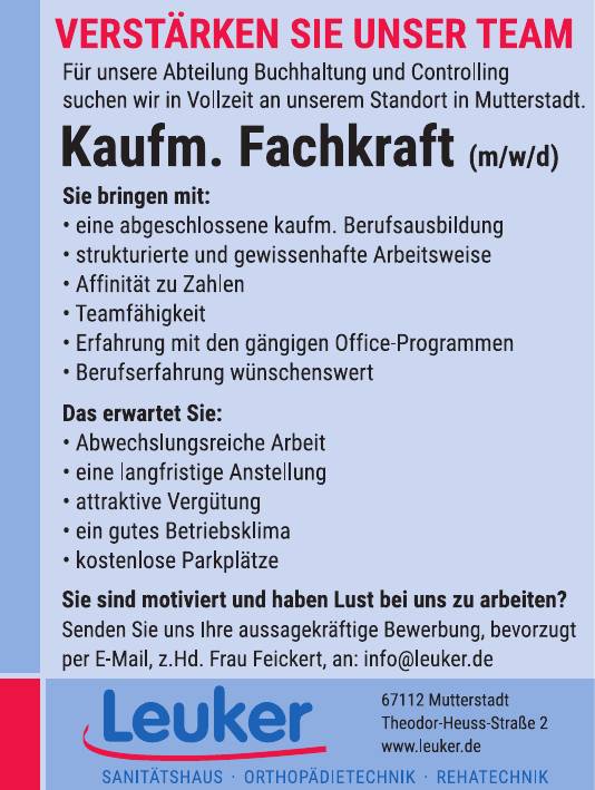 Senden Sie uns Ihre aussagekräftige Bewerbung, bevorzugt per E-Mail, z.Hd. Frau Feickert, an: info@leuker.de