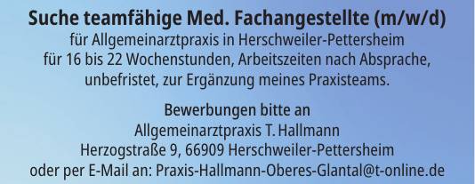 in Herschweiler-Pettersheim für 16 bis 22 Wochenstunden, Arbeitszeiten nach Absprache, unbefristet, zur Ergänzung meines Praxisteams.