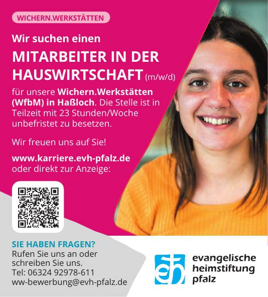 für unsere Wichern.Werkstätten (WfbM) in Haßloch. Die Stelle ist in Teilzeit mit 23 Stunden/Woche unbefristet zu besetzen.