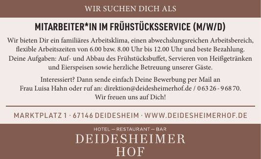 Interessiert? Dann sende einfach Deine Bewerbung per Mail an Frau Luisa Hahn oder ruf an: direktion@deidesheimerhof.de / 06326-968 70.