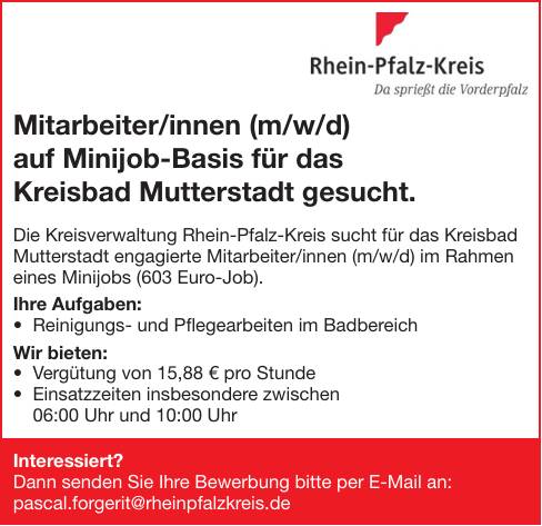 Die Kreisverwaltung Rhein-Pfalz-Kreis sucht für das Kreisbad Mutterstadt engagierte Mitarbeiter/innen (m/w/d) im Rahmeneines Minijobs (603 Euro-Job).