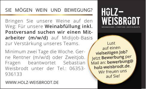 Minimum zwei Tage die Woche. Gerne Rentner (m/w/d) oder Zweitjob. Fragen beantwortet Sebastian Weisbrodt unter der Tel.: 06353-936133