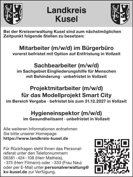 Bei der Kreisverwaltung Kusel sind zum nächstmöglichen Zeitpunkt folgende Stellen zu besetzen: