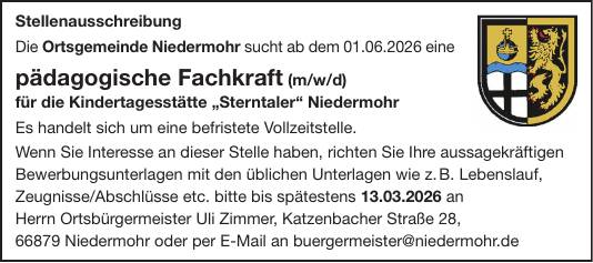 Die Ortsgemeinde Niedermohr sucht ab dem 01.06.2026 eine