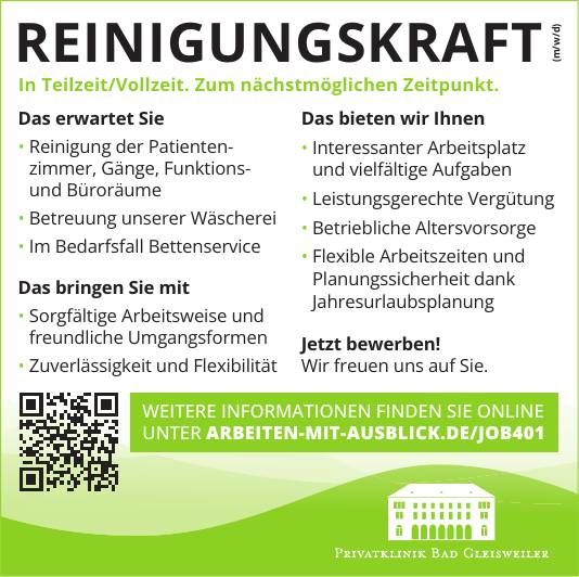 Alle AnzeigenReinigungskraft (m/w/d) in