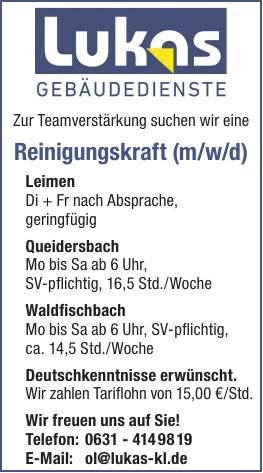 Alle AnzeigenReinigungskraft (m/w/d) in Waldfischbach-Burgalben