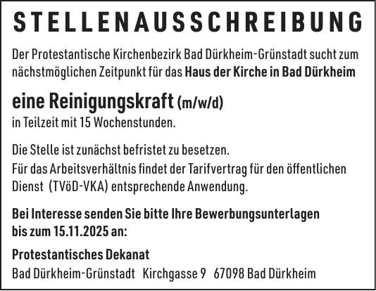 Der Protestantische Kirchenbezirk Bad Dürkheim-Grünstadt sucht zum nächstmöglichen Zeitpunkt für das Haus der Kirche in Bad Dürkheim