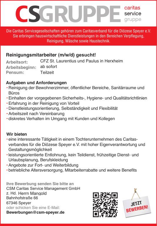 • eine interessante Tätigkeit in einem Tochterunternehmen des Caritasverbandes für die Diözese Speyer e.V. mit hoher Eigenverantwortung und Gestaltungsmöglichkeit