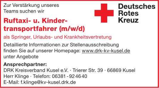Detaillierte Informationen zur Stellenausschreibung finden Sie auf unserer Homepage: www.drk-kv-kusel.de unter Angebote