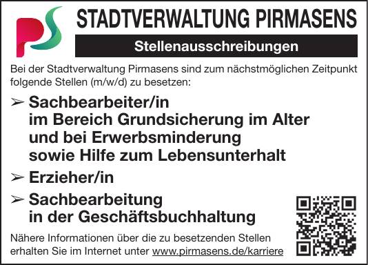 Bei der Stadtverwaltung Pirmasens sind zum nächstmöglichen Zeitpunkt folgende Stellen (m/w/d) zu besetzen: