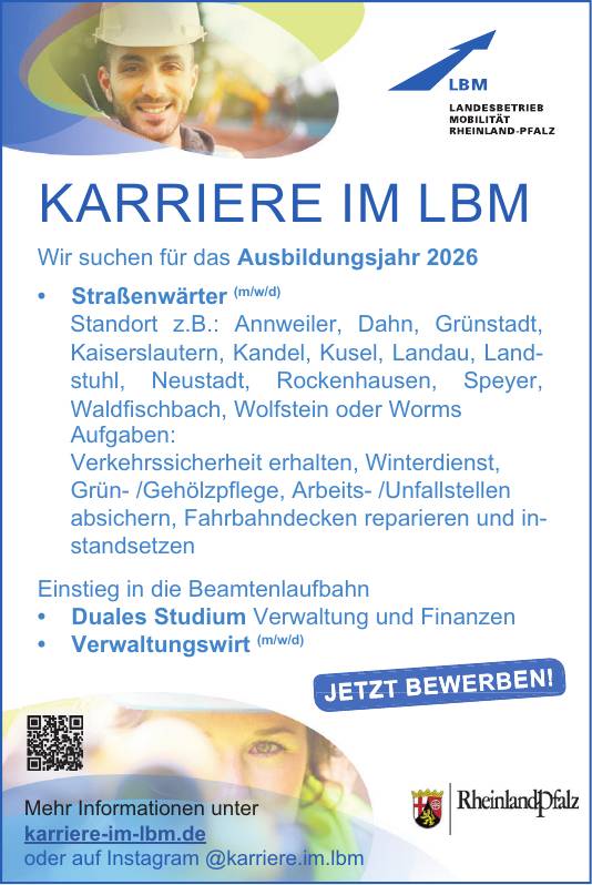 Alle AnzeigenStraßenwärter (m/w/d) in Worms , Duales Studium Verwaltung und Finanzen (m/w/d) in , Verwaltungswirt (m/w/d) in
